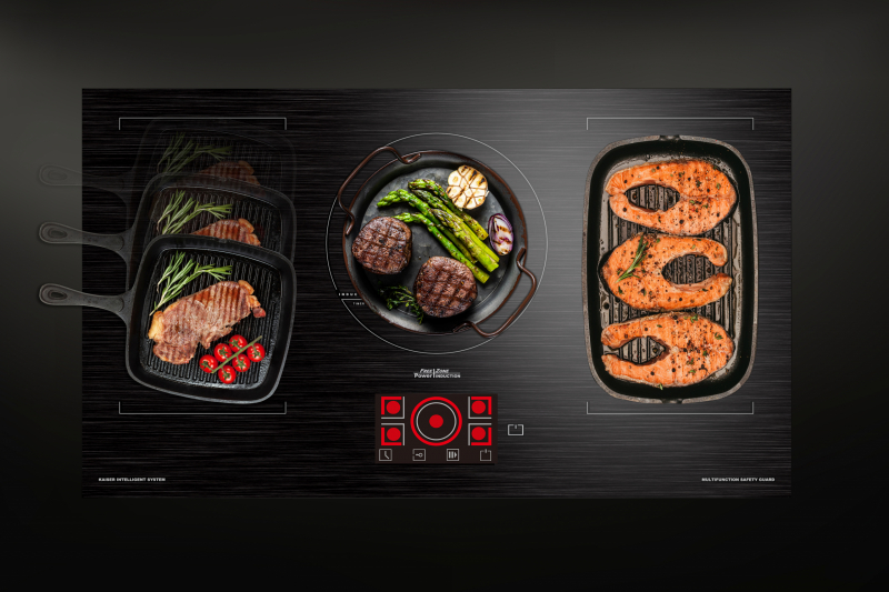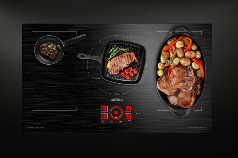 | Kochzonen | 5 QuickHeat Induktions-Kochzonen, davon2 x 2 flexible FREE-ZONE mit Barbecue-Funktion1 Kreis-Kochzone, alle mit Power-Funktion